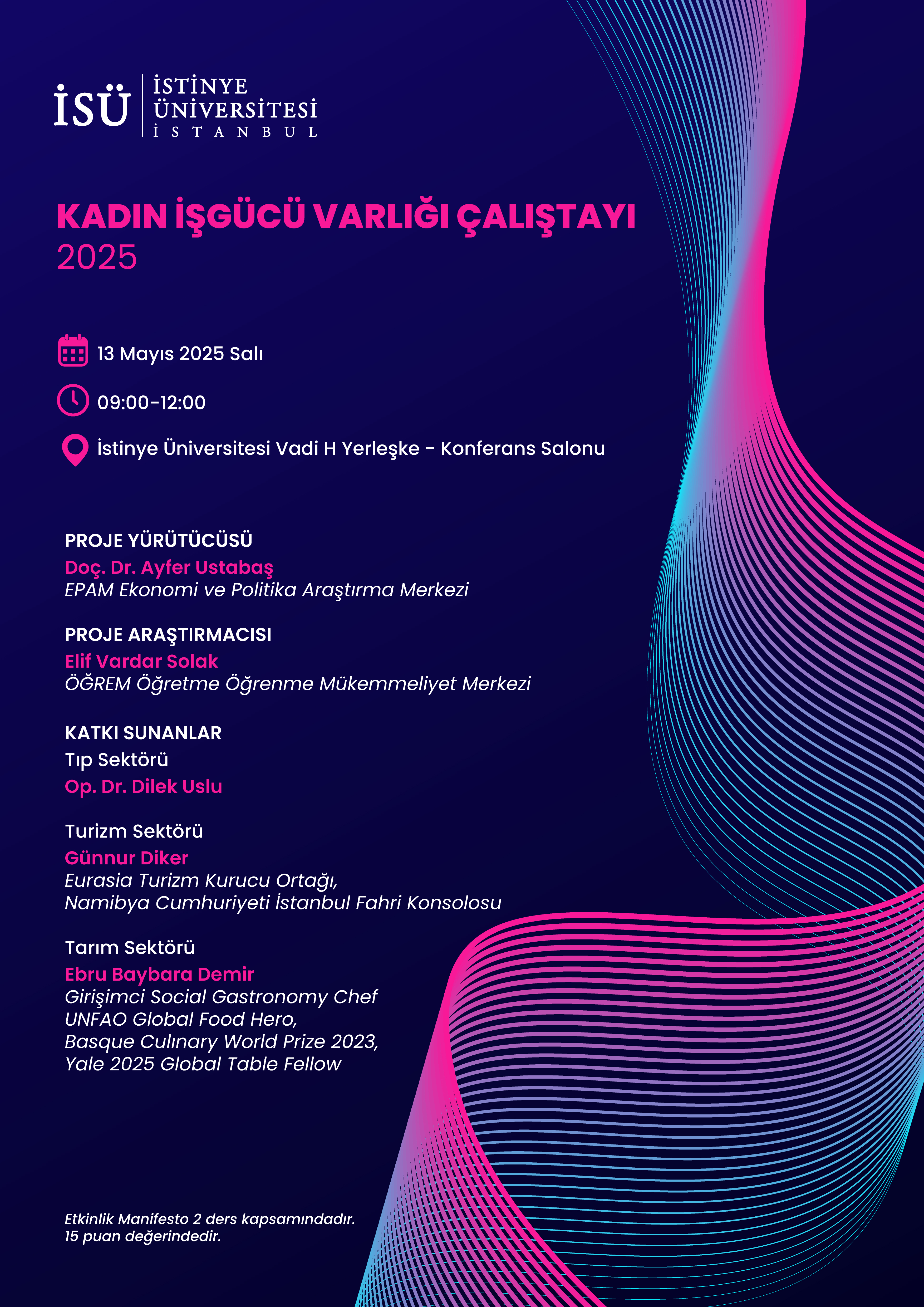Tübitak 2237A Bilimsel Eğitim Etkinlikleri Desteği kapsamında 2025 Kadın İşgücü Varlığı Çalıştayı organizasyonu çalışmaları 12. Kalkınma Programı çerçevesi ile uyumlu olan Tıp, Turizm ve Tarım sektöründen uzman kadın konuşmacıların katılımını üniversite öğrencilerimiz ile buluşturmak üzere İstinye Üniversitesi Öğretme Öğrenme Mükemmeliyet Merkezi ÖĞREM ile Ekonomi ve Politika Araştırmaları Merkezi EPAM tarafından planlanmaktadır.